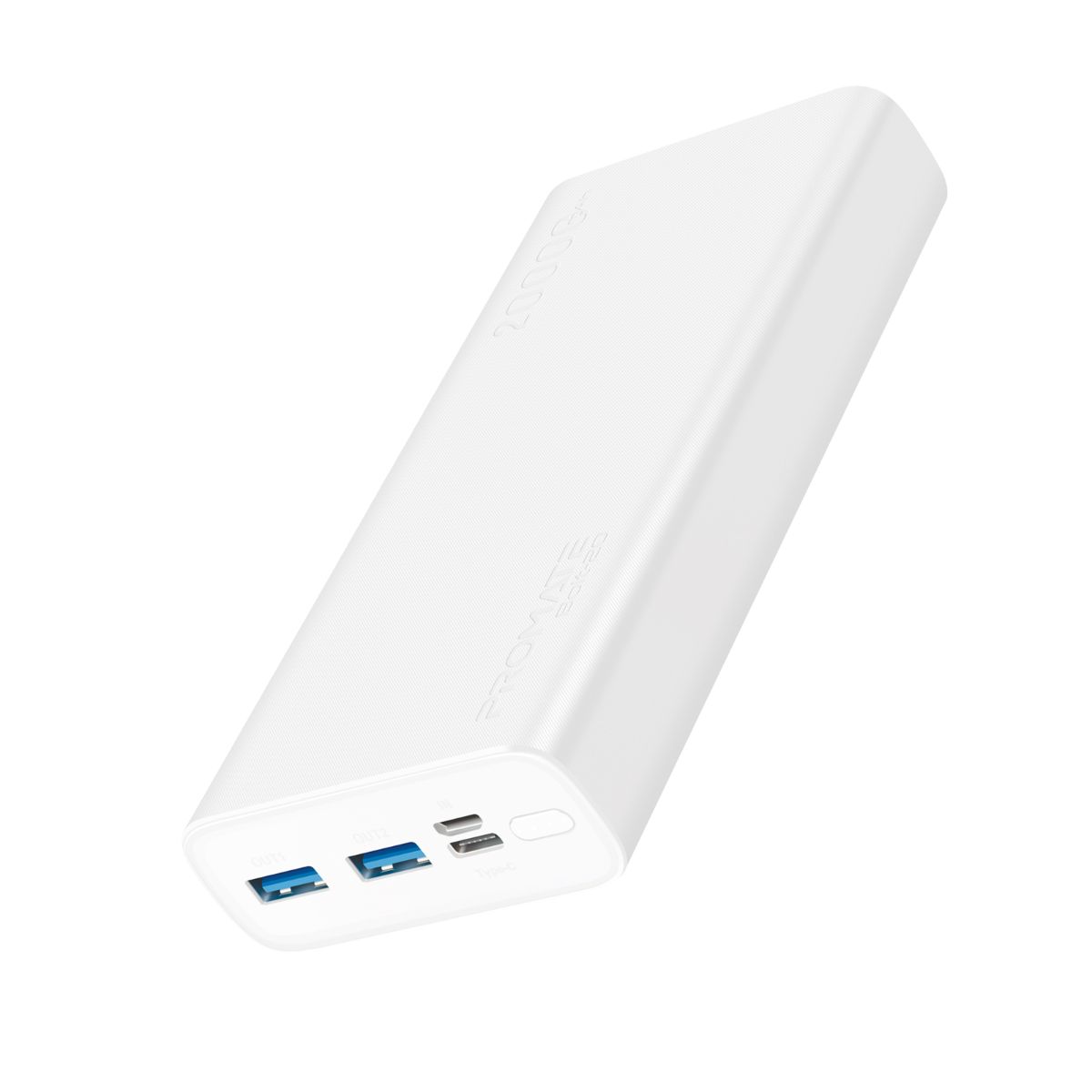 Promate - USB-C Qi Power Bank, Qi-Certified 10W Fast Wireless 20000mAh Battery Charger with 18W Two-Way Type-C Power Delivery, QC 3.0 Three USB Port, LED Display and Lightning, Micro USB Input for Qi and USB Enabled Devices, AuraTank-20 White