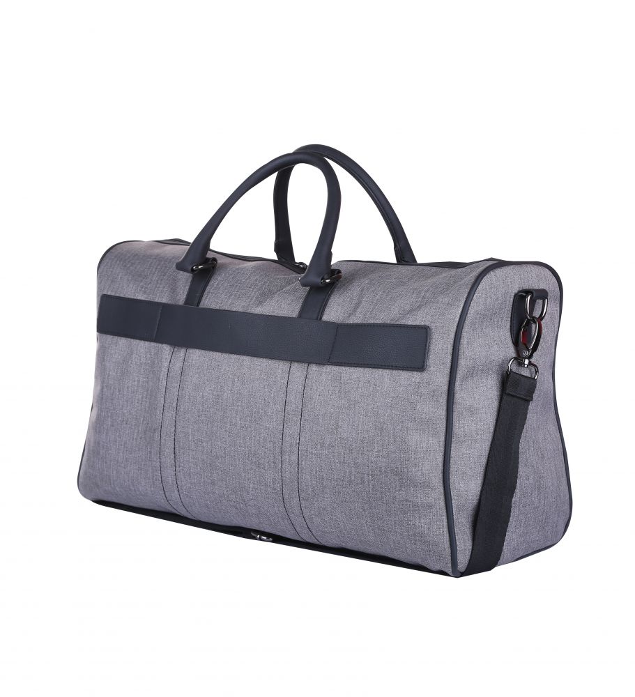 An Extensive Bag great for travelIng with so much stuff you can put inside this spacious bag and with magnetic pocket on front. Generally, made of Gray twill poly fabric, Trim: Black PU, Lining: Black190T, Zipper: Nylon, Puller: Matte black metal puller, Hardware: Gun metal, Shoulder strap: Black poly webbing.