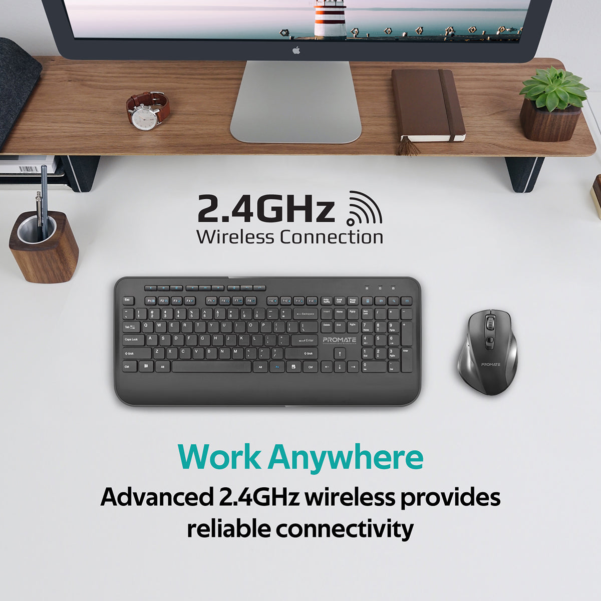 Increase your productivity with the wireless full-sized keyboard and a high-precision mouse so that you can work anywhere at any time. Get more done with the sleek ergonomic design of the keyboard and contoured shape of the mouse.