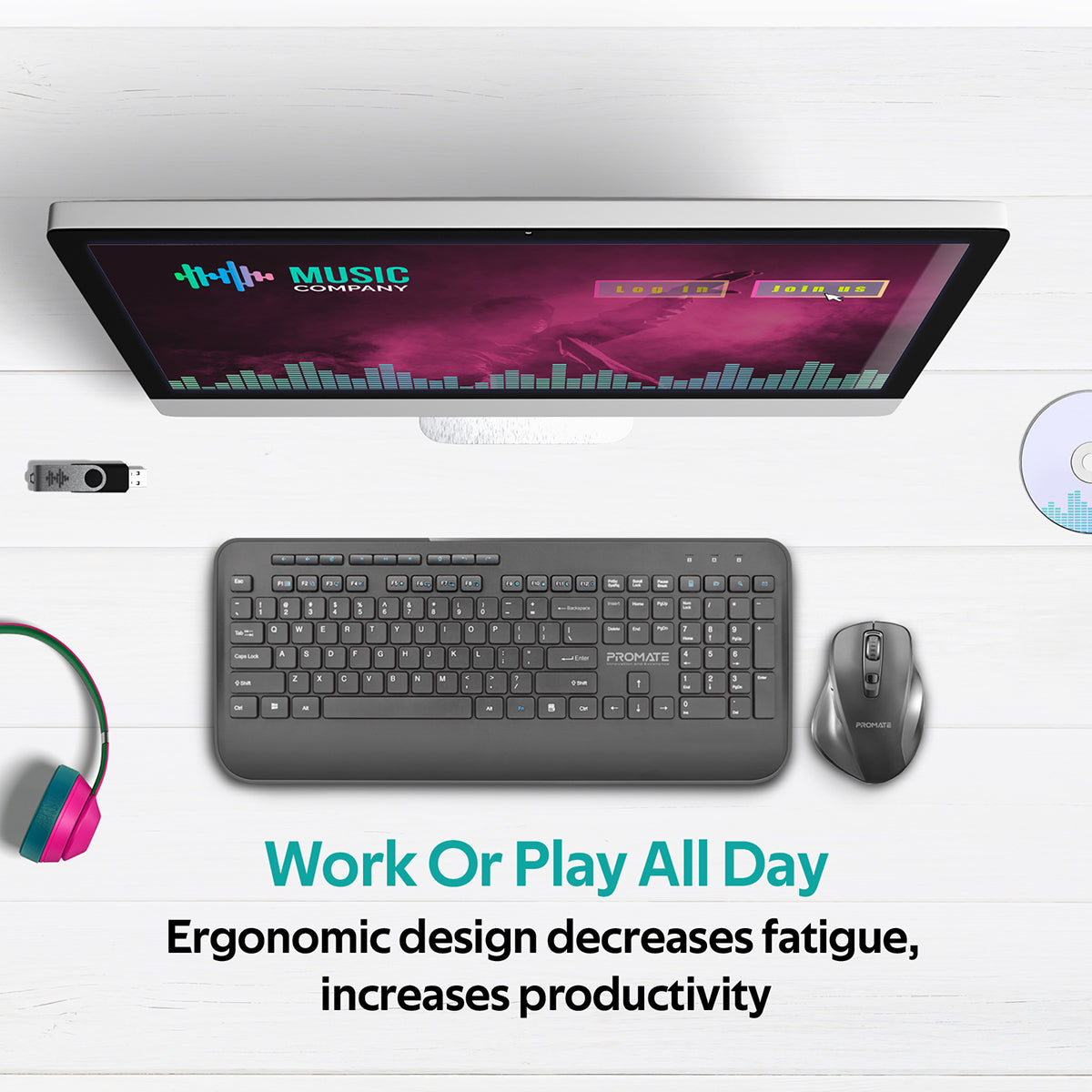 The keyboard features a supportive palm rest that gives you support for all-day typing with adjustable height for your perfect typing angle paired with the perfect fit of the contoured mouse for maximum comfort and productivity.