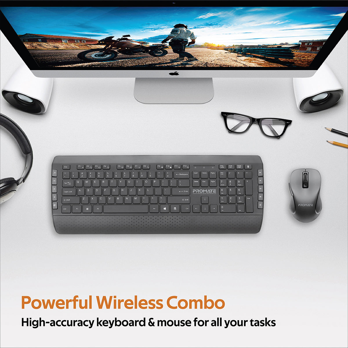 ProCombo-10 offers a wireless combo consisting of both a keyboard and a mouse that is built for all-day comfort with precision and reliability in mind. The keyboard features a full-size layout with 10 media keys and a palm rest, and the mouse features adjustable DPI and a contour shape design for your hand.