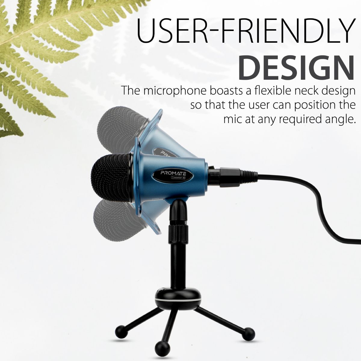 Conveniently stand with the help of the mini desktop tripod (Included). Supporting 360 degrees rotation, users can speak freely with this hand's free microphone Foldable Legs with 3 powerful anti-skid rubber leg caps can reduce desktop vibrations.